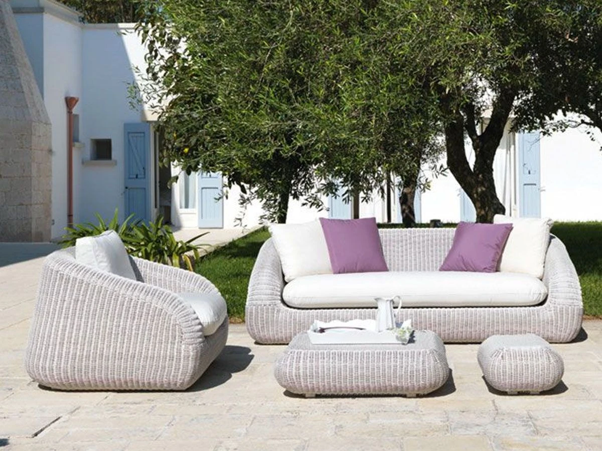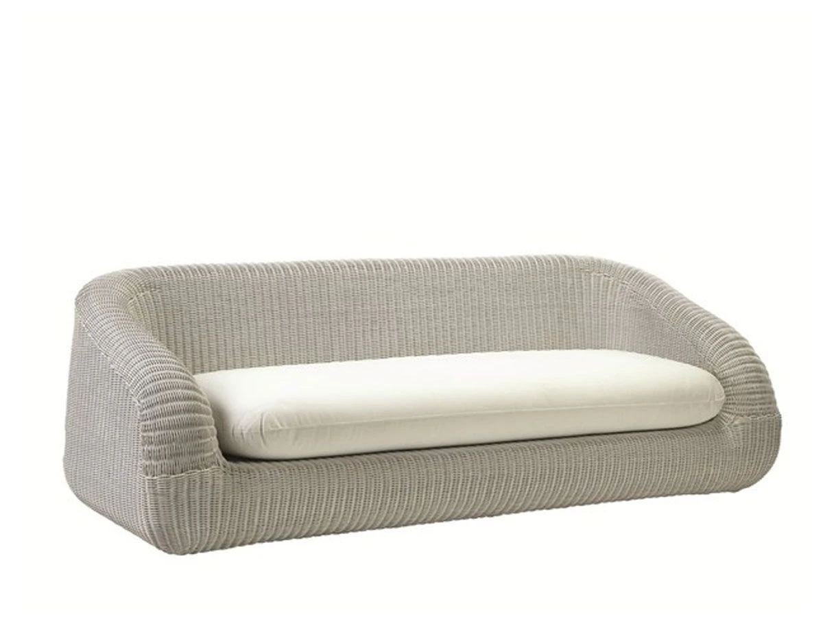 A soft and enveloping line, with a sober and contemporary design, the Phorma three-seater sofa is made of Etwick fiber, a synthetic wicker, with a natural look, woven entirely by hand. The sofa is completed by an acrylic cushion in ivory or dove gray colors. Even the structure of the sofa can be customized, choosing between the colors of the Etwick bark or white fiber.