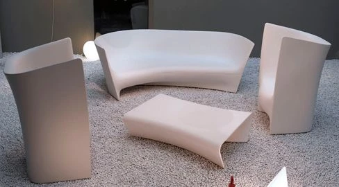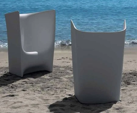 An outer polyethylene monobloc chair, designed for conversation, where everyone can find their ideal position more relaxed or more composed, according to the occasion. Volumes of fluids to counteract the thin bases and high backs that create protected areas to accommodate the guest.