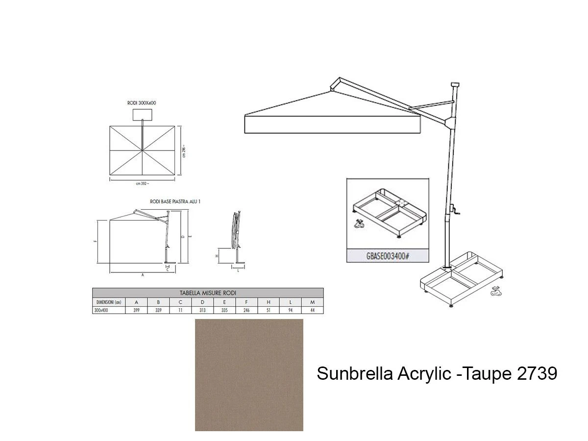 In this version Rodi Sunshade 300×400 (Pole on the 4 meters side) / Sunbrella mass dyed Acrylic Fabric Taupe 3729 / White Structure / White Base plate Alu 1