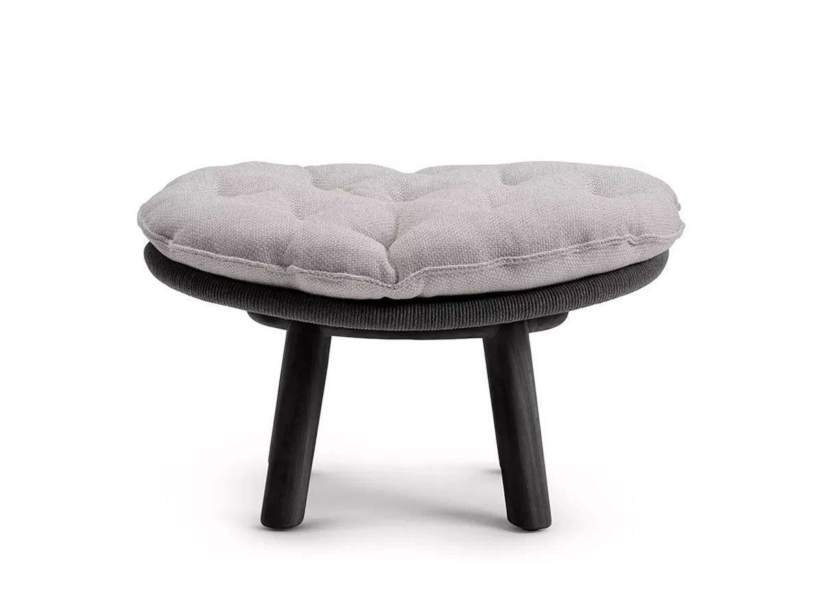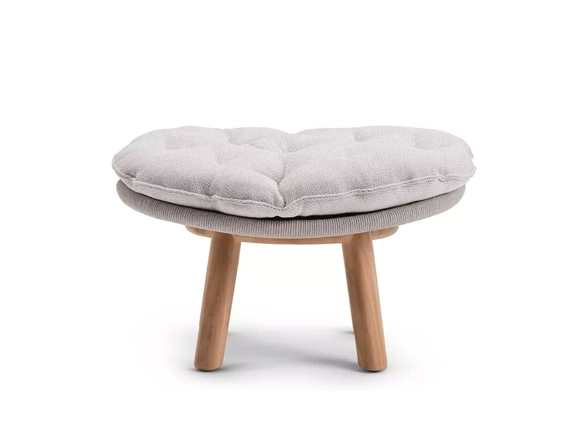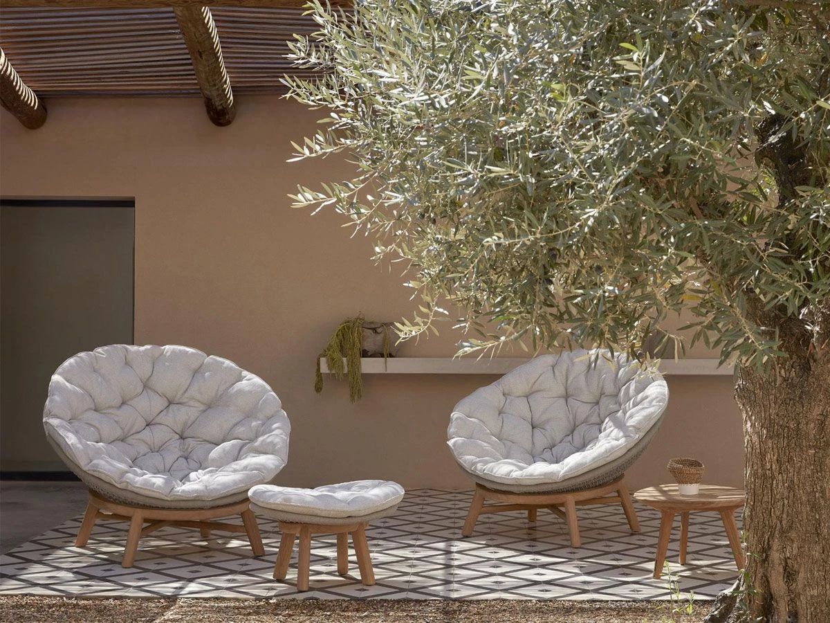 Sandua is an elegant outdoor furniture collection designed by Robert Hapelt for the Manutti brand. The series includes different elements, like a dining chair, upholstered armchairs, a footrest and a line of floor lamps. Structure in teak wood, shell in Dicord® braided rope, the cushion is covered in fabric suitable for outdoor use.
