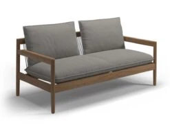 Saranac sofa designed by Mark Gabbertas for Gloster. Comfortable sofa made with natural teak structure, seat and back in raven-colored woven rope for outdoors and cushions in outdoor fabric, color of your choice.