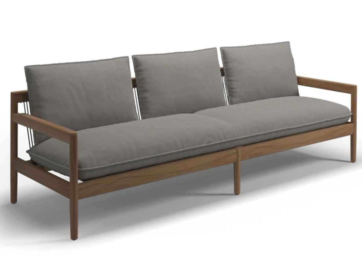 Saranac Sofa is part of a furniture collection designed by Mark Gabbertas that combines exceptional comfort with lasting aesthetics. The design approach that was sought when designing Saranac wanted to combine seduction and comfort and the result even exceeds expectations This very elegant and inviting sofa is designed to satisfy from all angles allowing it to function in larger spaces. The cushions are contained in a decidedly contemporary solid teak structure that incorporates braided rope that shapes the seat and back and combines with slightly angled and tapered legs.