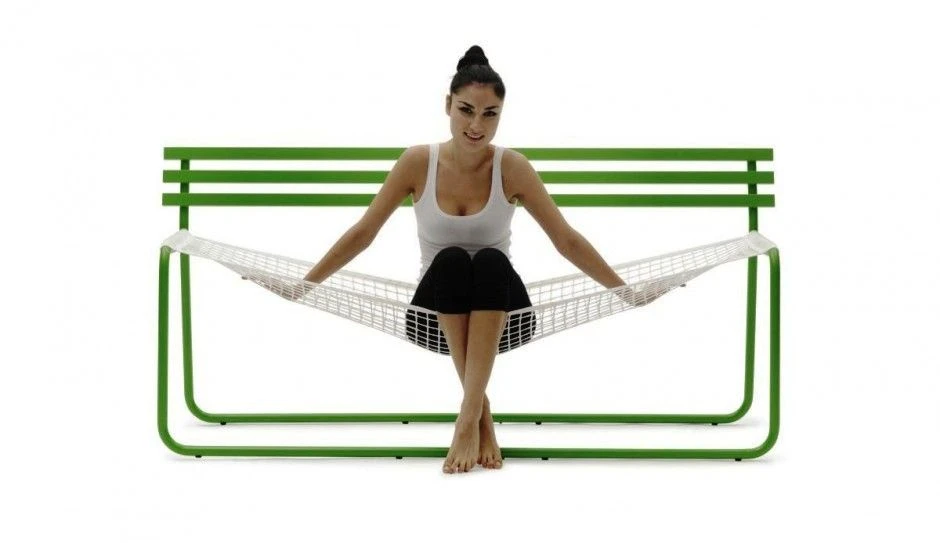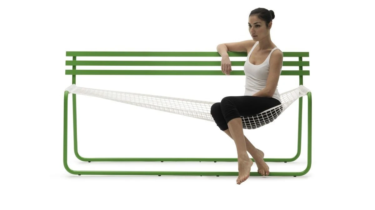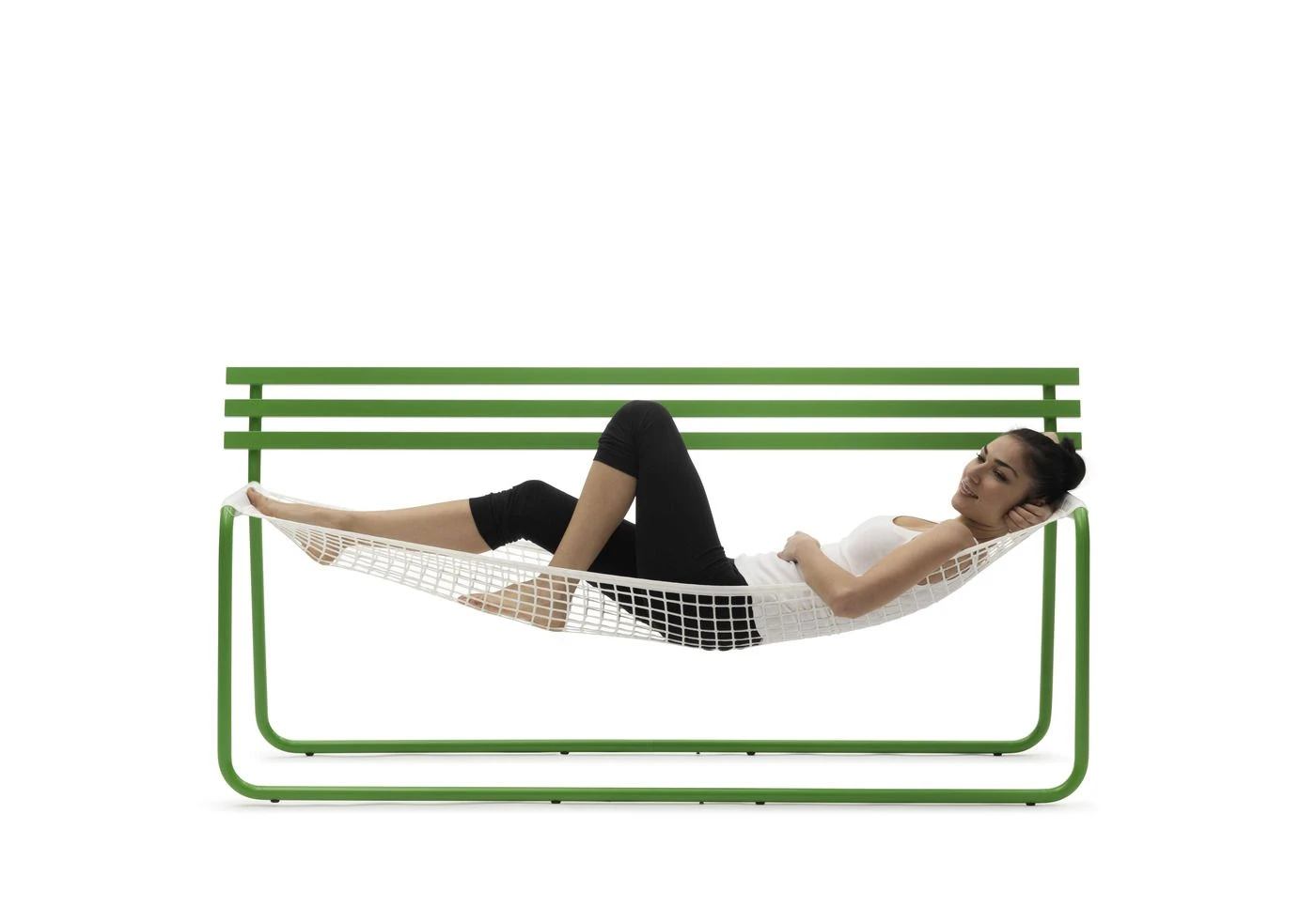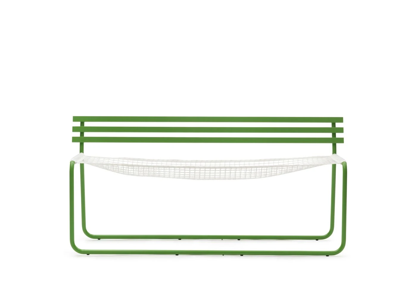 Lying down on a bench is surely one of the most pleasant moments of ordinary happiness. Siesta is a simple yet unexpected seat that, while maintaining the iconography of an outdoor bench, allows for free, fun and comfortable use.From designer Emanuele Magini, a fun piece of furniture that easily finds a place in the balcony or garden due to its small size. A perfect bench for sitting, lying down and relaxing, starting with the idea of an outdoor bench, it introduces the function of a hammock using a suspended polypropylene net. Absolutely inviting in spite of its lightweight appearance, Siesta offers great stability and robustness thanks to its painted tubular metal frame, which, thanks to its epoxy finish, stands up perfectly to outdoor use. Green frame and white nylon mesh.