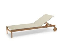 Pelagus sunbed is intended for pure relaxation and aesthetic pleasure derived from its distinctive yet sober design language, a spirit imbued with the entire collection of which it is part a series of elements from the elegant contemporary expression. Extremely comfortable and flexible, can be placed in 5 positions. The beautifully crafted teak frame is expressive yet simple, its archetypal wooden wheels make it easy to move around to follow the sun. The weatherproof Sling fabric seat brings a modern edge with its lightness and transparency. Pelagus is a simple and comfortable sunbed, with simple lines that allow it to be placed in different environments.