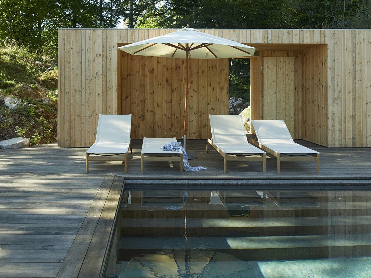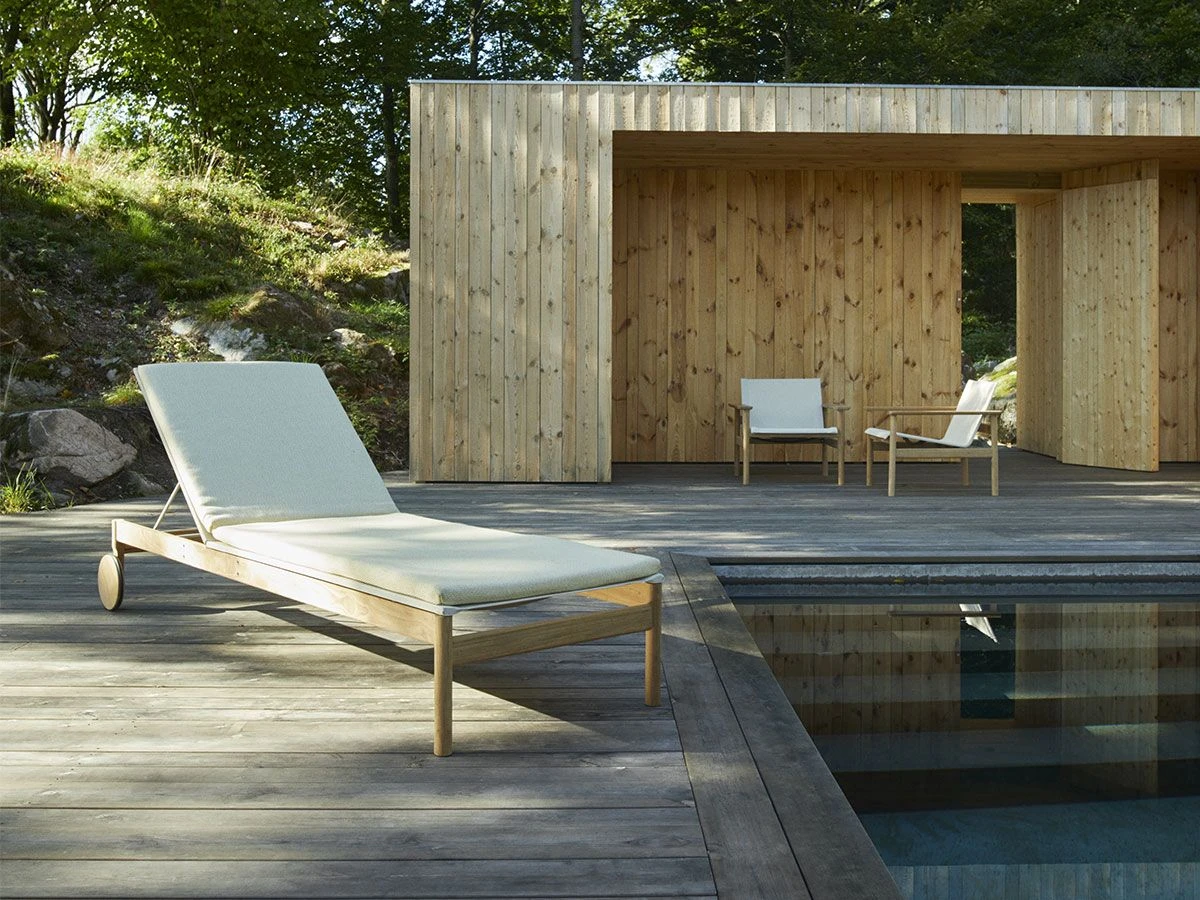 Pelagus sunbed designed by NOTE Design Studio for Skagerak. Made with a teak frame and fabric shell suitable for outdoor use.