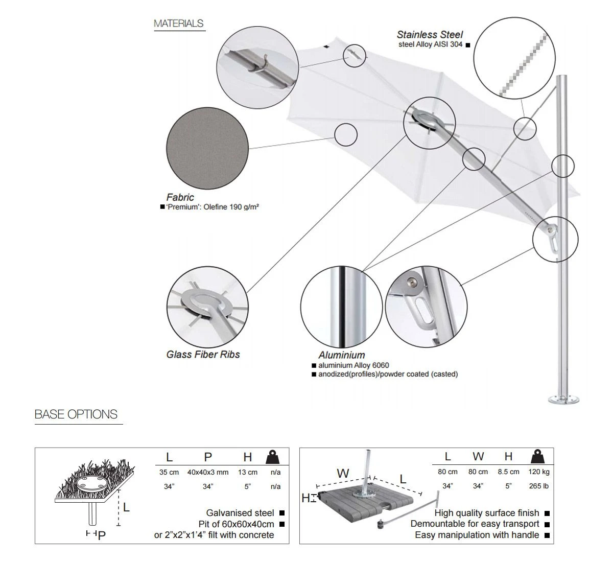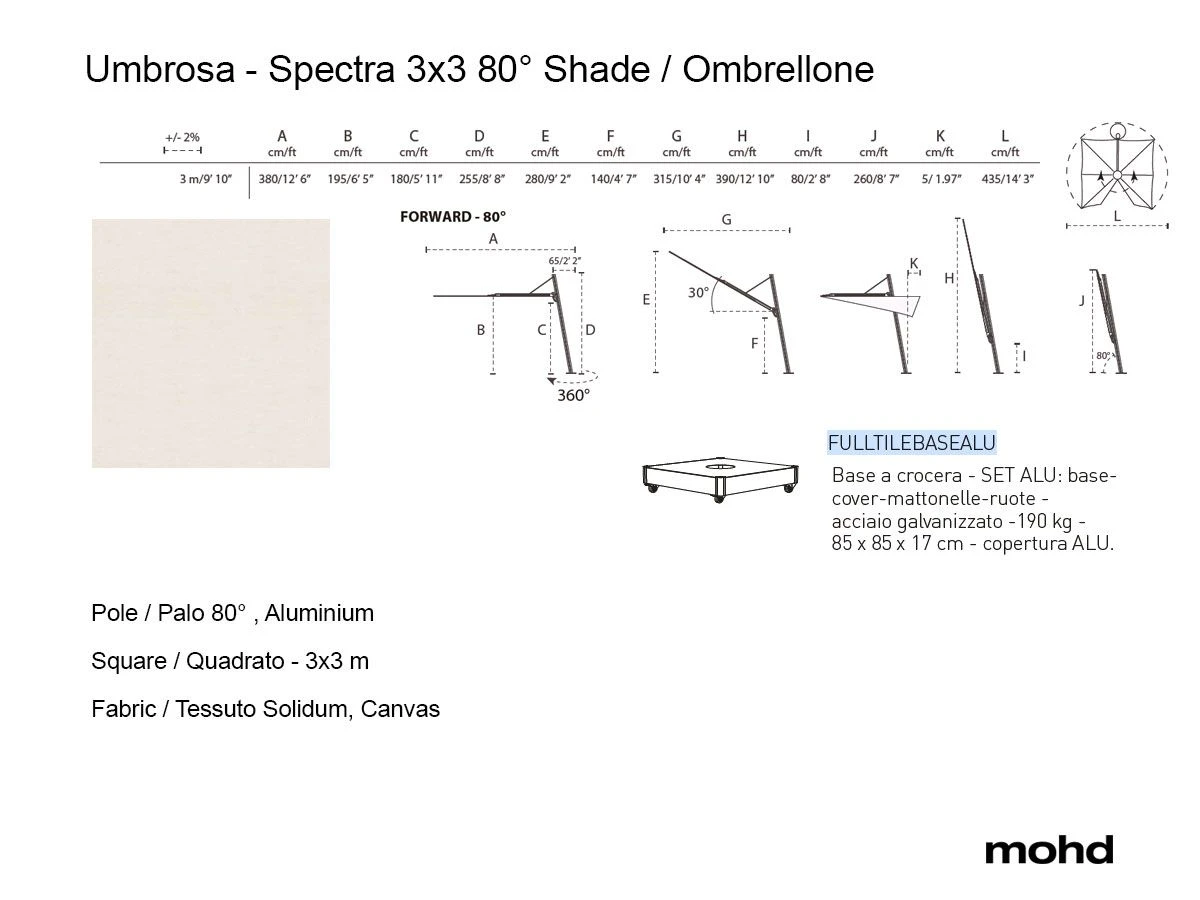 In this version Spectra Square Umbrella 300×300 Solidum Canvas Fabric, Base Aluminium Finish 180 kg 85x85x17