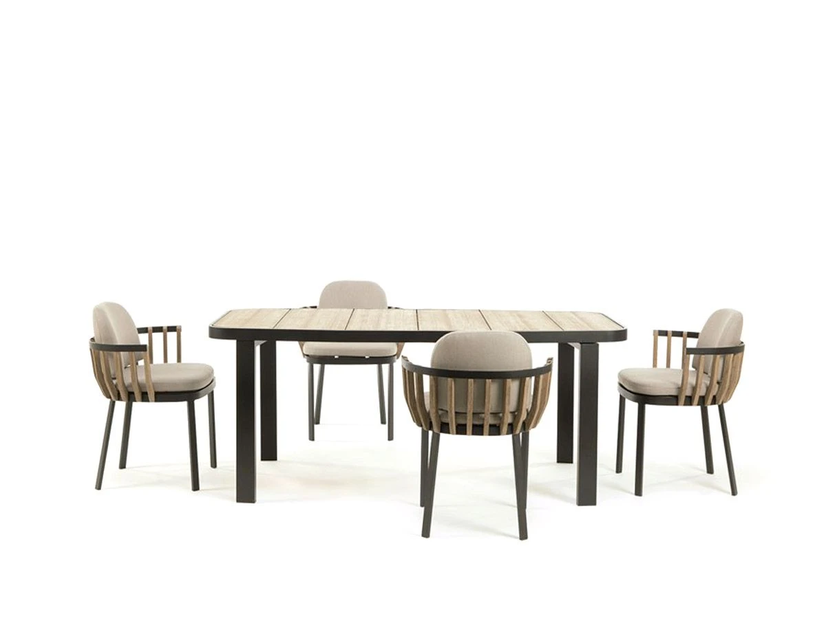 Dining armchair in natural or pickled teak and aluminum.