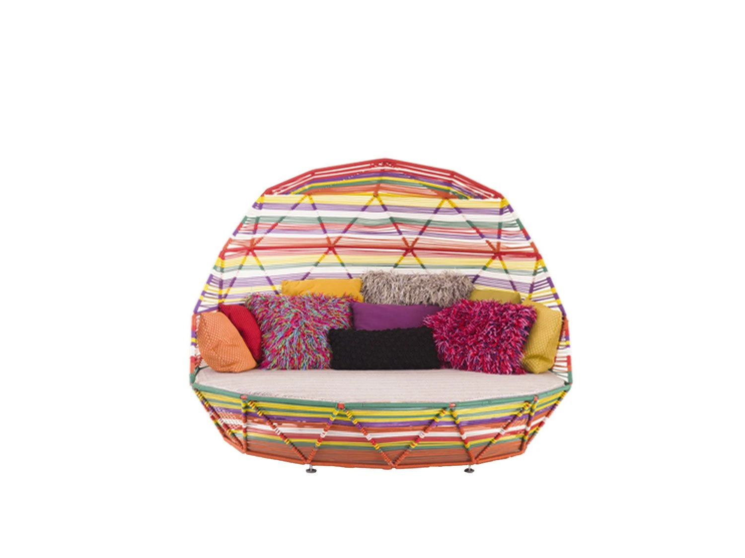 Red painted steel structure RAL 3020 and multicolor technopolymer wire strand. The Day bed mattress is made of expanded polyurethane suitable for outdoor use; the pillows are made of polyester fiber for outdoor use. The collection comes with pillows.