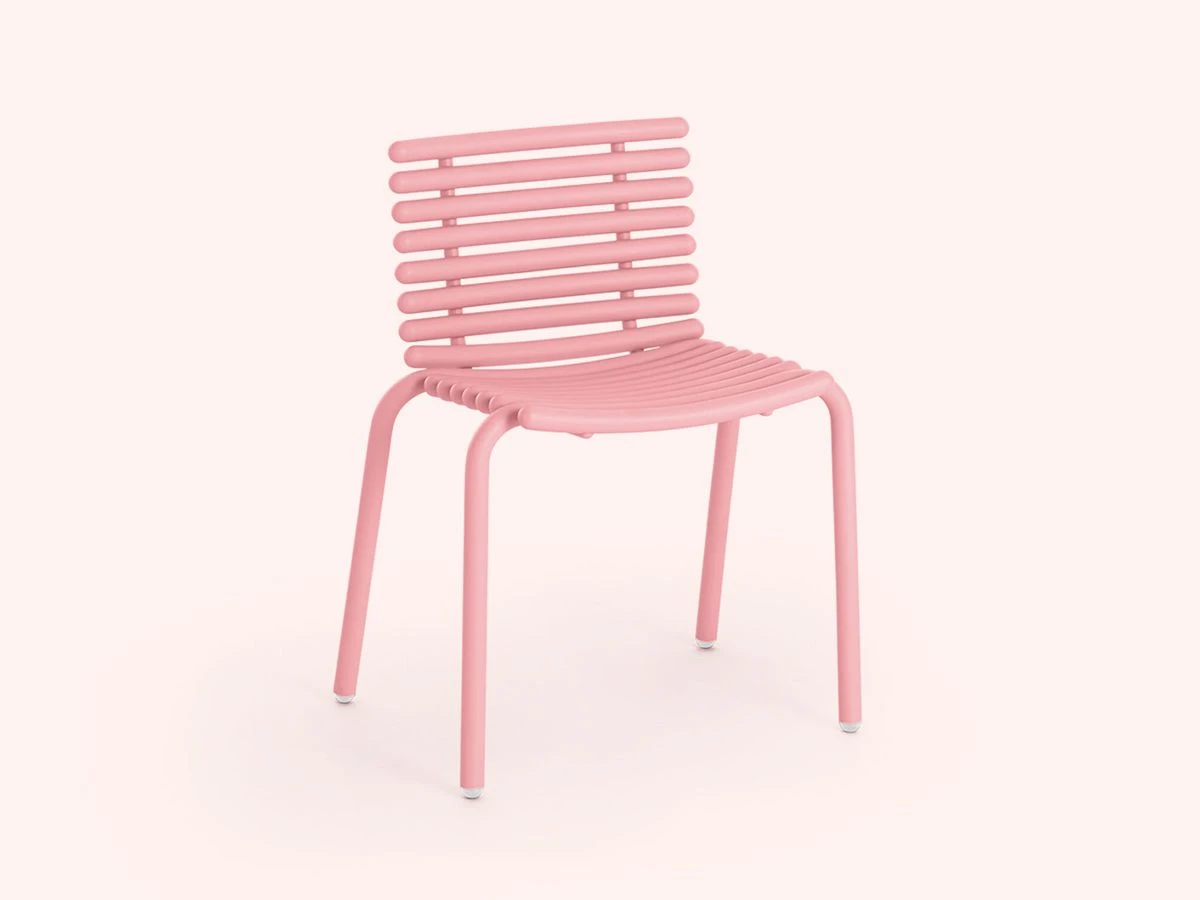 Stackable chair in powder-coated tubular aluminium. Recyclable. Seat height 46 cm. Available in 7 colours.