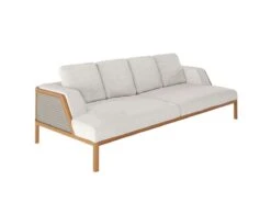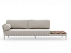 Vipp Open-Air is a refined outdoor furniture collection designed and produced by the Vipp brand. The series includes several elements, including a chair and lounge chair, dining table, side tables and a sofa, which is also available in a version with a side table. Outdoor powder-coated aluminium, plastic glider, outdoor fabric, outdoor foam with wadding and outdoor inner cover, washable synthetic belts, polyrattan.