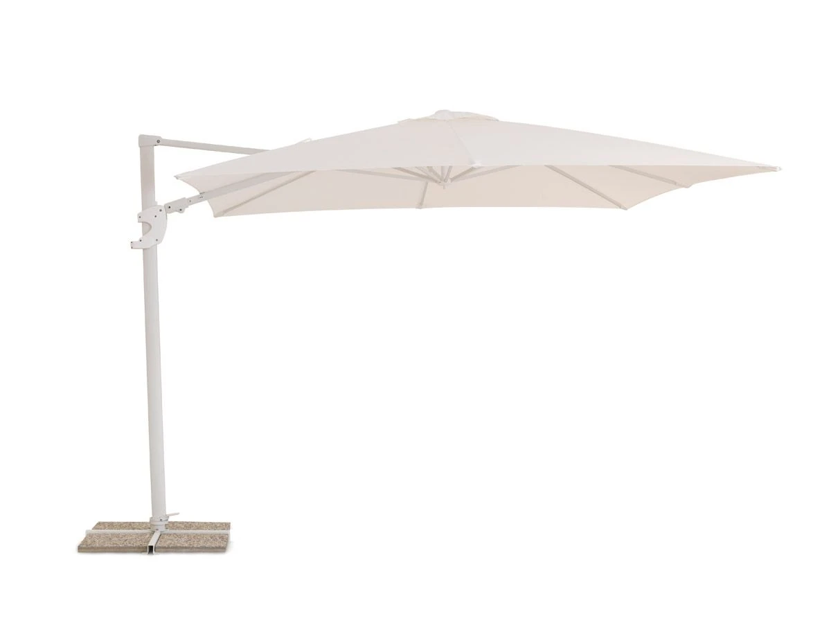 – Stell white cross base, with 4 grit made plates. For an optimal stability we racommend you to put 4 grit plates 50x50x3.5 (weights not incluted) Tilt pole allows parasol 360° degrees rotation.