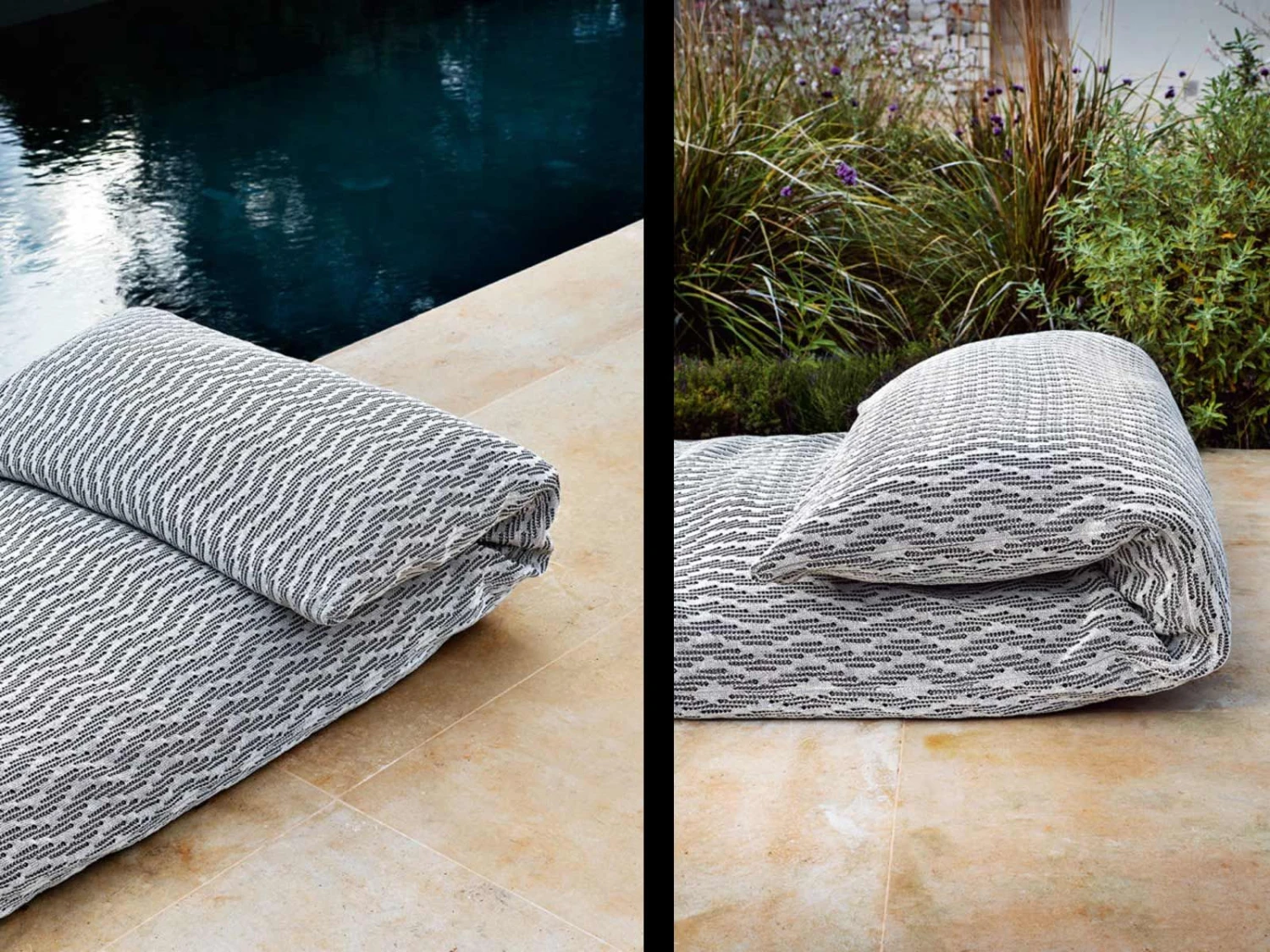 This Daybed made of outdoor fabric and recycled foam padding inside a rain bag can be used in both residential and contract or public environments. Available in two colors and in two sizes, the special wavy texture of the product characterizes it and enhances its composure, formality, and rigor. These daybeds will be ideal companions for any open space.
