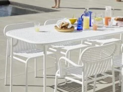 Week-End is a complete collection of garden furniture. Designed to be practical and easy to move, all the chairs in the collection are stackable. The design of the collection is expressed through a contrast of soft and rigid shapes. Starting from oval and round shapes, such as the seat backrests, we find rigid signs that are exemplified through the horizontal and vertical slats, which also underline the relationship between full and empty spaces, transmitting a sense of lightness suitable for outdoor contexts for which this collection is designed. The collection also includes chairs, armchairs, lounge chairs, high and low stools and benches with and without backs.